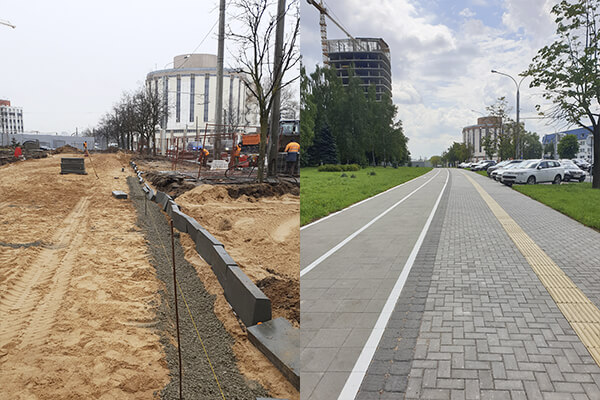 Демонтаж существующего тротуара, устройство корыта под новый тротуар с вывозом и утилизацией непригодного грунта, укладка тротуарной плитки.
